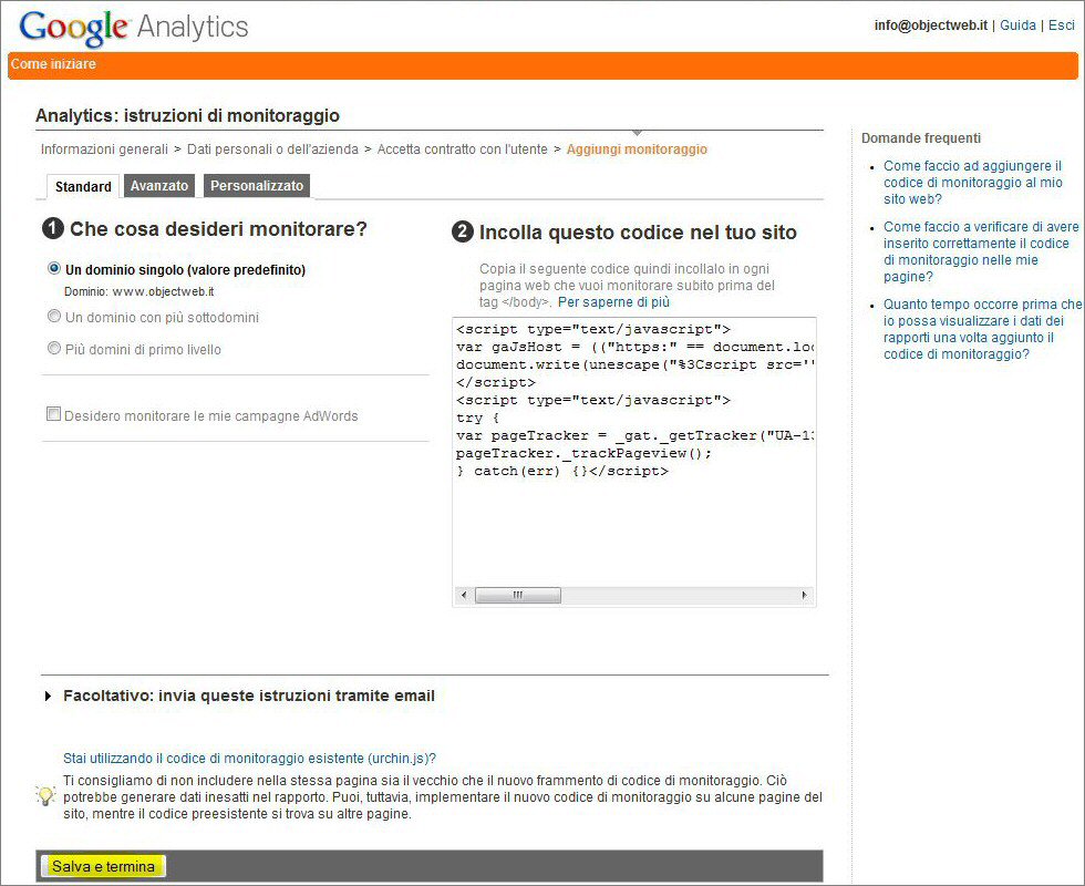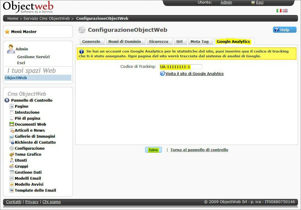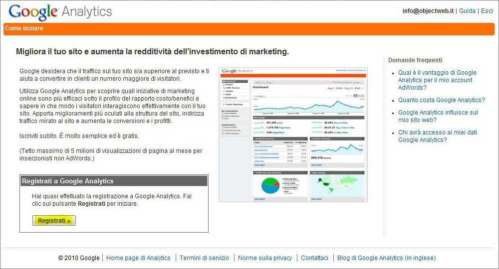 In questo articolo ti spieghiamo come creare un sistema di statistiche sul tuo sito per poter effettuare analisi sui visitatori, sulle sorgenti di traffico, sulle parole chiave utilizzate e tanto altro ancora. La soluzione proposta permette di integrare in modo semplice nel tuo sito su ObjectWeb il potente motore di statistiche di Google Analytics. I passi da effettuare sono: